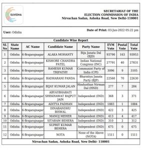 As per ECI’s candidatewise report released in the evening, BJD candidate Alaka Mohanty has polled total 93,953 votes including 163 postal votes.