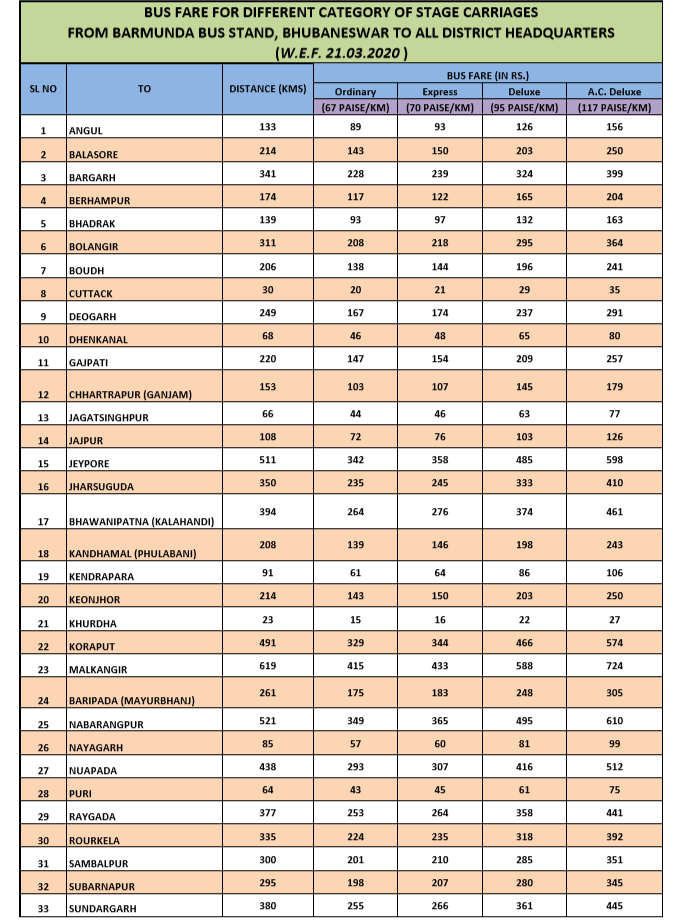 Here’s the chart of bus fare between Bhubaneswar and different towns for different category of buses.