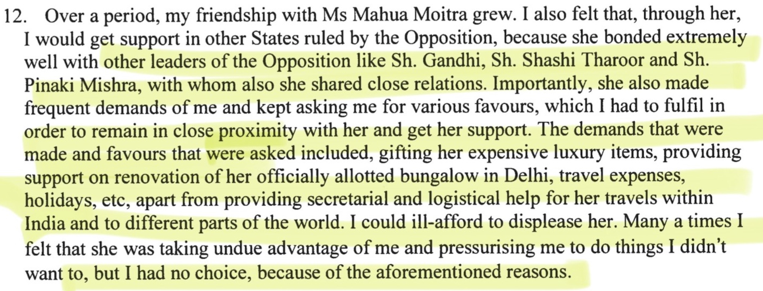 Hiranandani added that Moitra “made frequent demands” including “expensive luxury items, support on the renovation of her officially allotted bungalow in Delhi and logistical help for her holidays.”