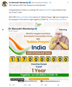 In another tweet, he congratulated and thanked the scientists for developing the indigenous vaccine. “Today, on the occasion of #1YearOfVaccineDrive, a postal stamp has been issued on the indigenous Covaxin developed jointly by ICMR and Bharat Biotech, realising PM Narendra Modi ji’s dream of Self-Reliant India,” he tweeted.