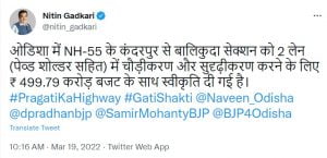 Union Minister of Road and Surface Transport, in a tweet on Saturday, said Rs 499.79 crore has been sanctioned for Kandarpur in Cuttack district to Balikuda in Jagatsinghpur section of NH-55 in Odisha. The fund will be utilised for widening and strengthening to 2 lanes including paved shoulders.