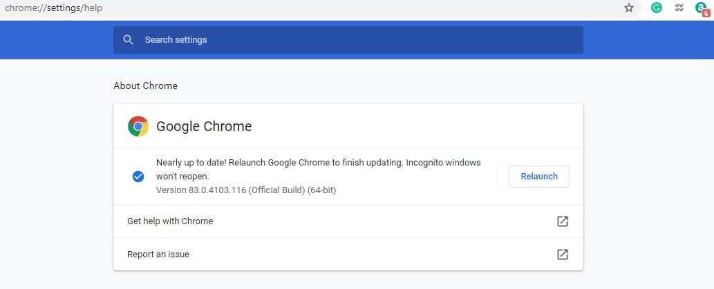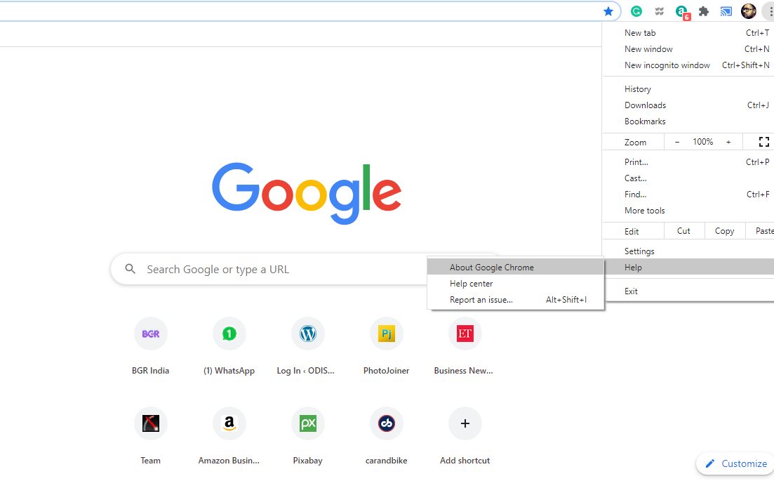 To update, click on the 3 dots at the top right corner of Google Chrome. Select ‘Help’ and then click on ‘About Chrome’. Click on update if required. For Android users, go to Play Store and open Google Chrome and press on ‘Check for updates’.
