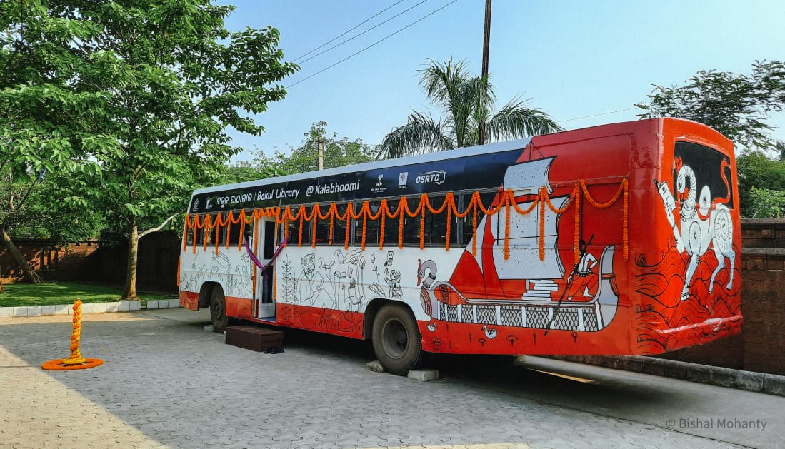 The outer portion of the bus has been attractively designed using motifs from Pattachitra and other traditional crafts of Odisha. There is a beautiful biota, a metaphor for stories travelling across seas, which has its sails looking like a book. At the back, one gets to see the Nabagunjara reading a book as well.