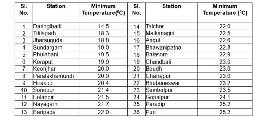 Meanwhile, the mercury dropped to 14.5 degrees Celsius in Daringibadi while five other places – Titlagarh (18.3), Jharsuguda (18.8), Sundargarh (19), Phulbani (19.5) and Koraput (19.6) – recorded temperature below 20 degree Celsius.
