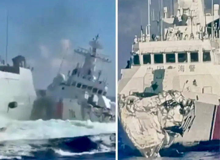 The video shows a Chinese Coast Guard ship and a larger navy vessel, marked with the number 164, colliding with a loud crash. Photos and additional footage later revealed that the coast guard vessel suffered major damage to its front section, with the bow crumpled inward.