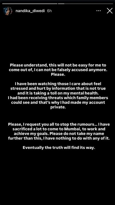 “I had been receiving threats which family members could see, and that’s why I had made my account private. Please, I request you all to stop the rumours… I have sacrificed a lot to come to Mumbai, to work and achieve my goals. Please do not take my name further than this; I have nothing to do with any of it. Eventually, the truth will find its way,” she said.