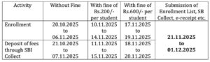 The students can fill up the forms from October 20 to November 6. The fees have to be deposited through SBI Collect between October 21 and November 7. They can still fill up the forms from November 10 to 14 by paying Rs 200 as fine along with the fees between November 11 and 15. The regular students are allowed to fill up the forms between November 17 and 19 by paying a fine of Rs 600. The fees have to be deposited between November 18 and 20.