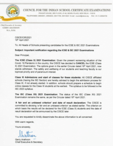 “Given the present worsening situation of the COVID-19 pandemic in the country, the CISCE has decided to cancel the ICSE (Class 10) 2021 examinations. The options given in the earlier circular dated April 16 now stands withdrawn. The safety and well being of our students and teaching faculty is our topmost priority and of paramount interest,” a circular issued by CISCE said on Monday.