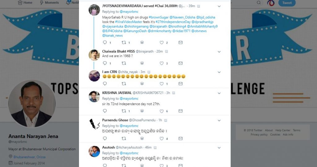 While wishing Bhubaneswar denizens, the mayor inadvertently mentioned about celebrating the 27th Independence Day and was later trolled by Twitterati.