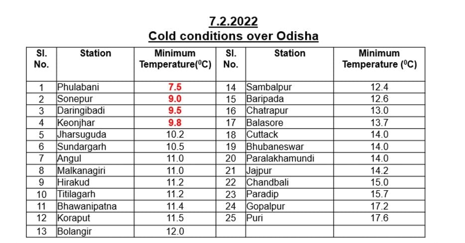 Phulbani was the coldest at 7.5 degree Celsius followed by G Udayagiri at 8 degree Celsius, Similiguda at 8.2 degree Celsius, Sonepur at 9 degree Celsius, Daringbadi at 9.5 degree Celsius and Keonjhar at 9.8 degree Celsius, the Bhubaneswar Meteorological centre informed on Monday.
