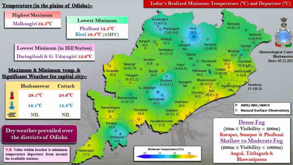 Dense fog was seen in Koraput, Sonepur and Phulbani and moderate to shallow fog in Angul, Titlagarh and Bhawanipatna this morning.