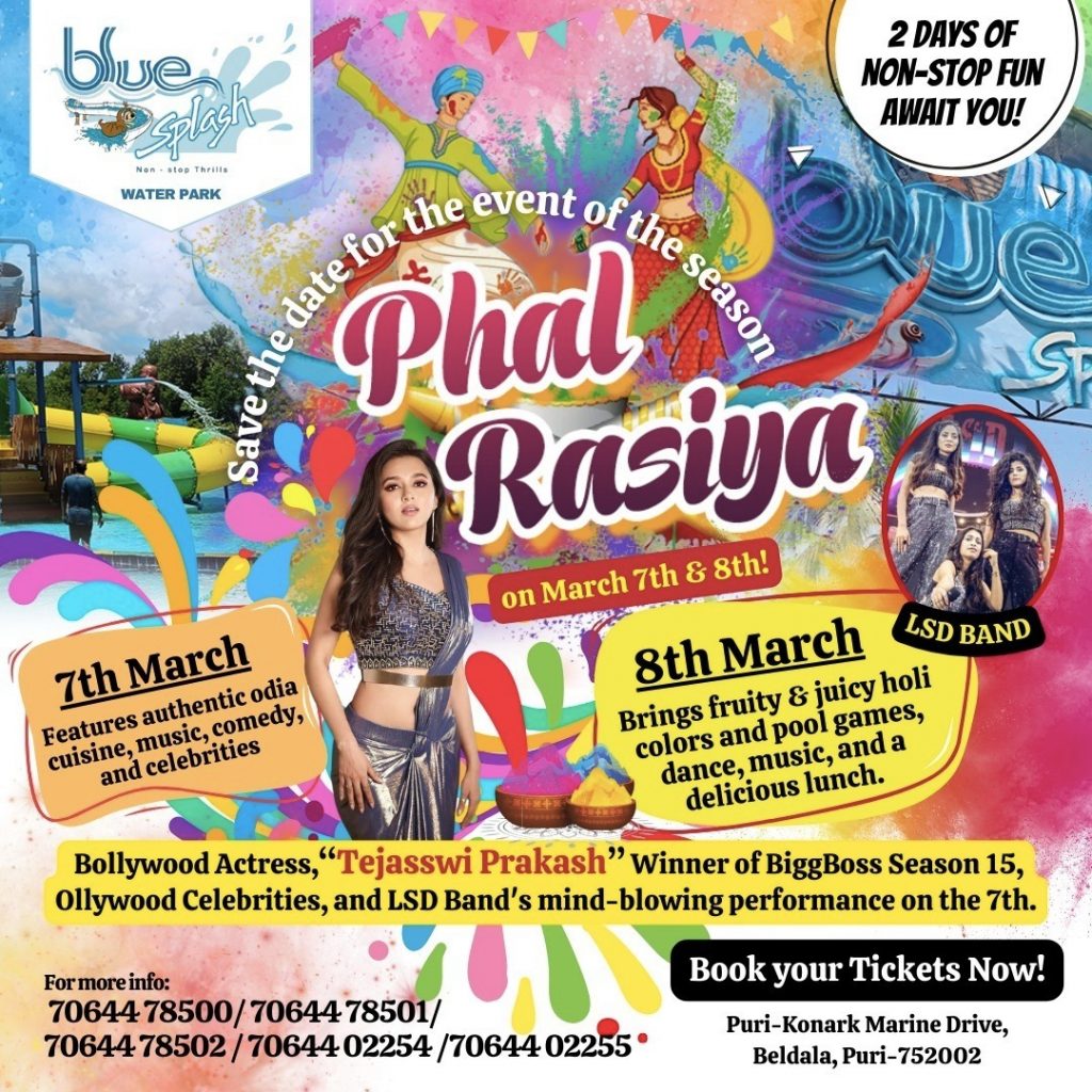 - Phal Rasiya is being organized by the Blue Splash Waterpark on the Puri-Konark marine drive. They have fruity and juicy colours for you to play with and some pool games with dance and music followed by a delicious lunch. Various Ollywood actors such as Abhijit Das, Rishhi and Debasmita will join the celebrations today. Tejaswi Prakash and LSD band’s performance stole the show yesterday.