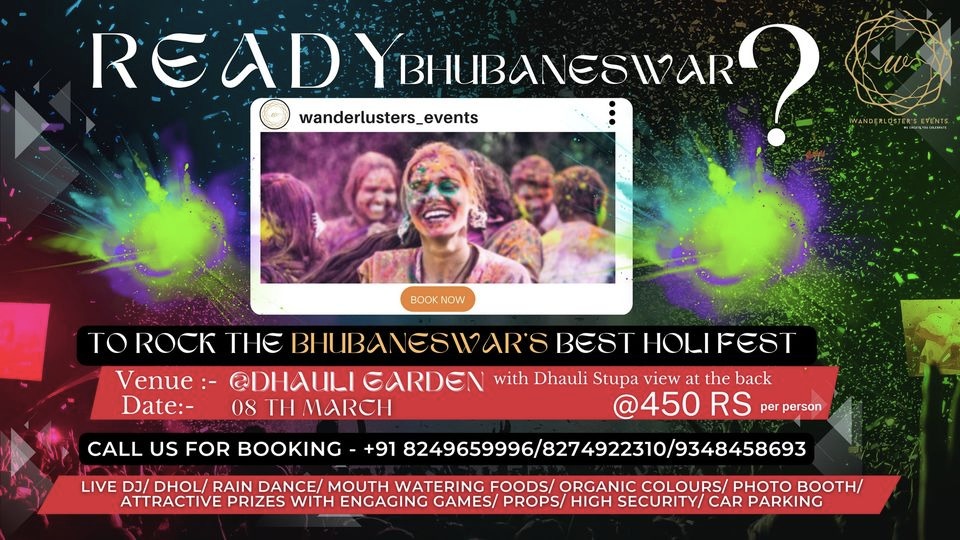 - The Wanderlusters events have organised a holi party at the Dhauli garden with organic colours. The celebration will also feature rain dance, live DJ and dhol. The crowd will also get a chance to win attractive prizes by playing games. Mouthwatering dishes are also a part of the celebration.