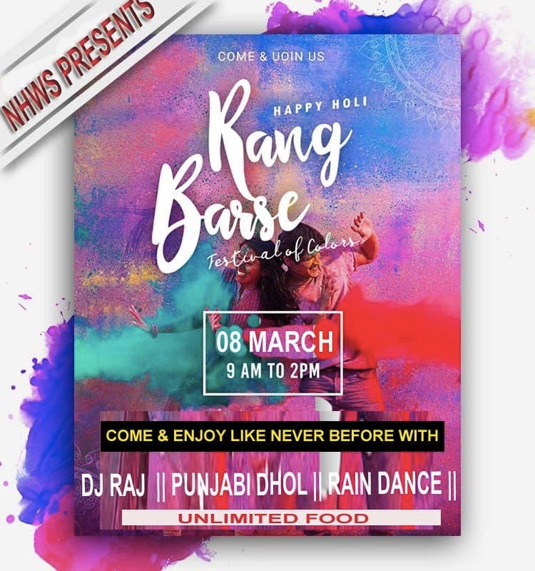 - Rang Barse is bring organised in the Northern Heights with live DJ, Punjabi Dhol and rain dance. They have a special food menu for holi with more than 10 dishes at Rs.300 per person only.