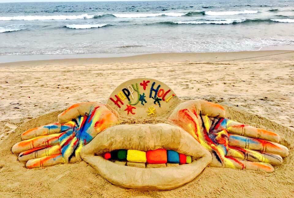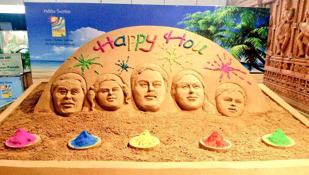 Sand artist of international fame Sudarsan Patnaik has created two sculptures, on Puri sea beach and Biju Patnaik International Airport in Bhubaneswar, wishing people on Holi.