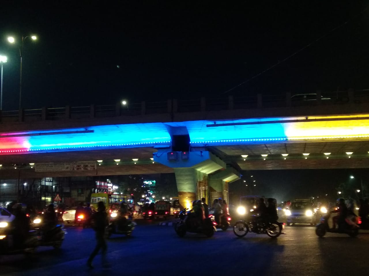 The lighting starts at 5.30 pm and continues till midnight. The colour pattern taken from the national flags of each nation is coming one after another and the predominant colours on the flags are imparted through the LED technology on both sides of the flyover from Ashok Nagar and Sishu Bhawan ends. The roof of the flyover and the spans, which was painted with murals by city-based artists during the Asian Athletic Championships -2017, is also illuminated with beautiful LED lights.