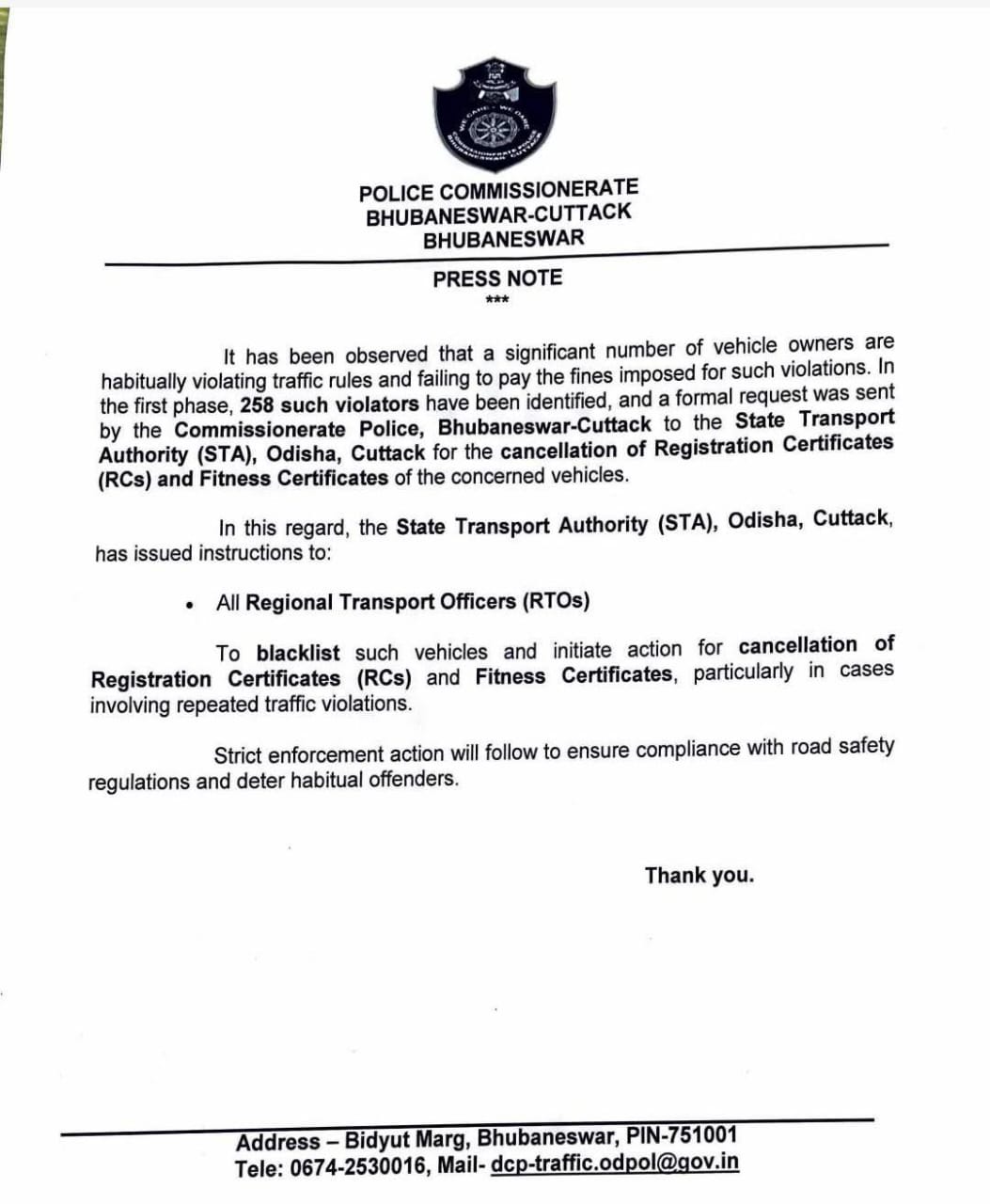 Bhubaneswar: The Bhubaneswar-Cuttack Commissionerate Police has recommended the cancellation of registration certificates (RCs) of 258 vehicles involved in habitual traffic violations.