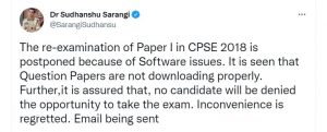 “The examination of Paper-I in CPSE 2018 has been postponed because of software issues. It will be held on a date which will be announced shortly. No candidate will be denied to appear at the test,” Sarangi said in a tweet.
