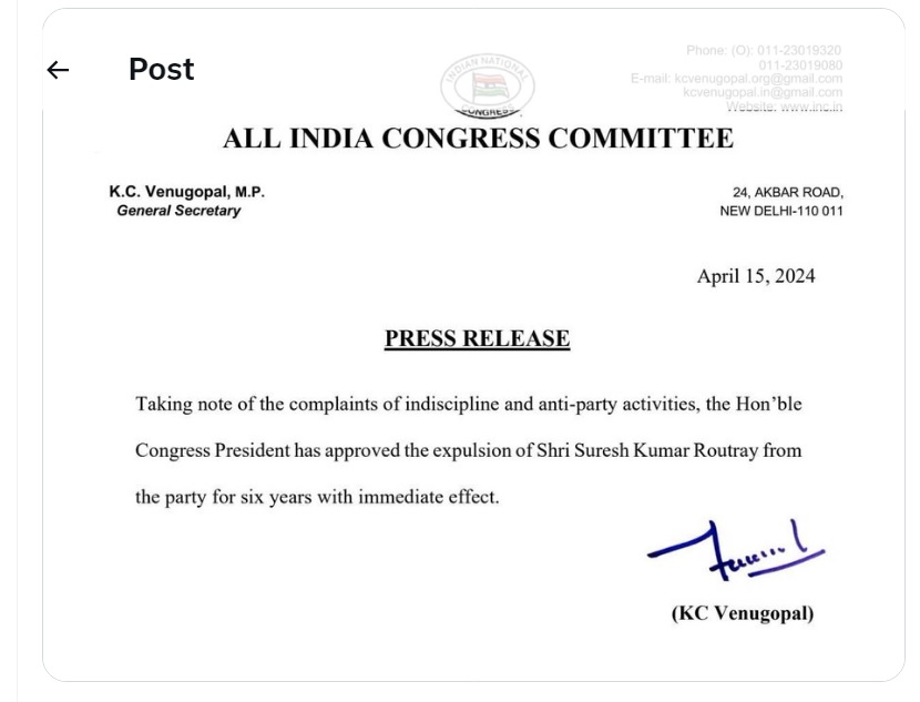 In a press release, KC Venugopal, general secretary of All India Congress Committee, said the Congress president has taken note of the complaints of indiscipline and anti-party activities against Suresh Routray. “The Congress president has approved the expulsion of Suresh Routray from the party for six years with immediate effect,” it added.