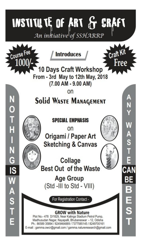 Grow With Nature – This 10-day craft workshop will have classes on Origami/paper art, sketching and canvas, collage making and creating best out of waste. It is open to children of Class III to VIII.