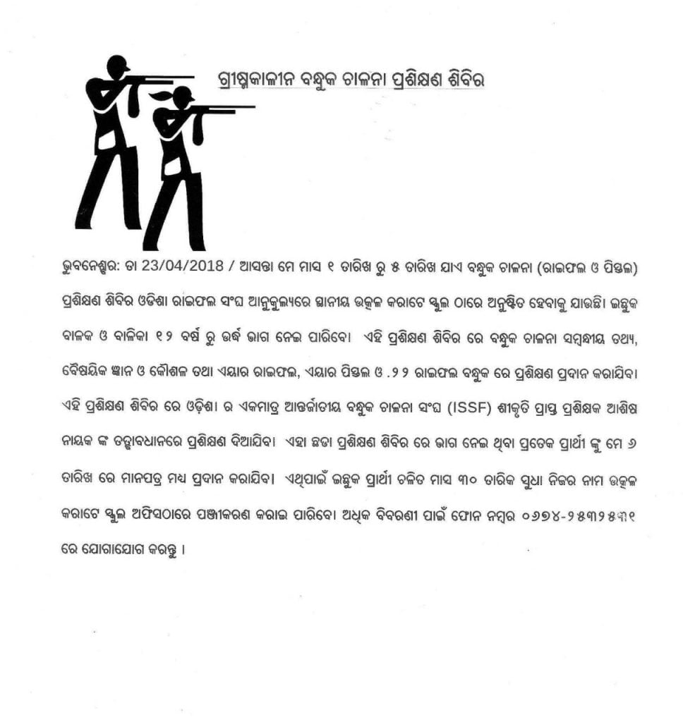 Shooting Camp – Odisha Rifle Association is organizing a summer shooting camp at Utkal Karate School where anyone above 12 years can register. There will be training in air rifle, pistol, and 22 rifle. The last date for registration is April 30!