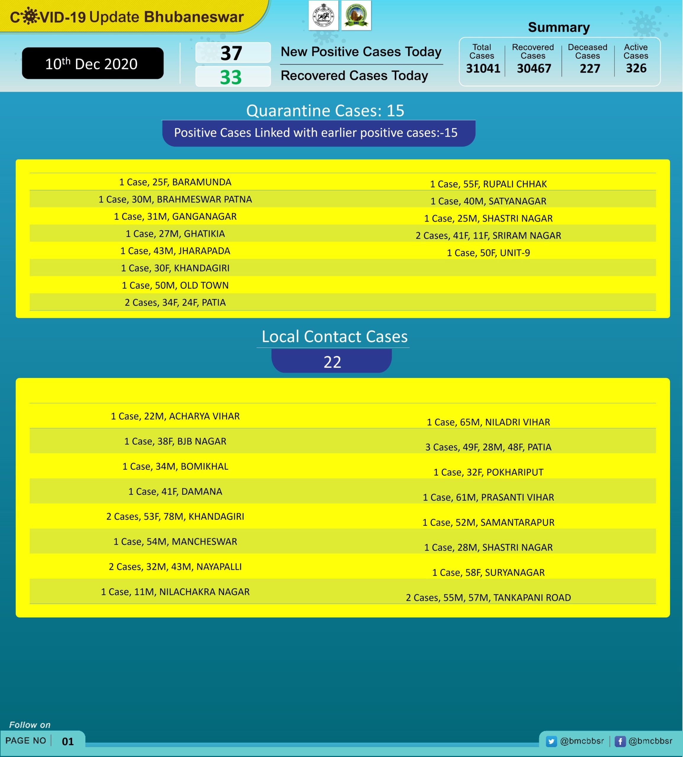 According to Bhubaneswar Municipal Corporation (BMC), 22 of those new cases are local contacts and 15 from quarantine.