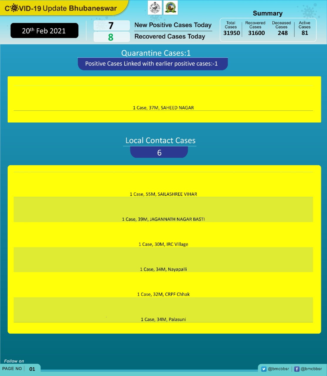 Of the new cases, one is from quarantine and six are through local contacts. Of total local contact cases, one each was reported from Sailashri Vihar, Jagannath Nagar Basti, IRC Village, Nayapalli, CRPF Chhak, and Palasuni.