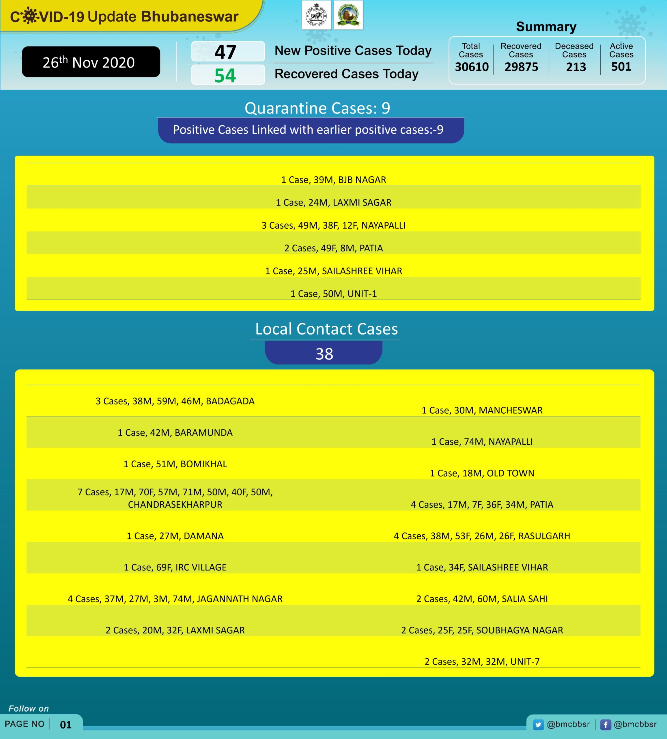 According to the Bhubaneswar Municipal Corporation (BMC), 38 of the new cases are local contacts and 9 from quarantine.