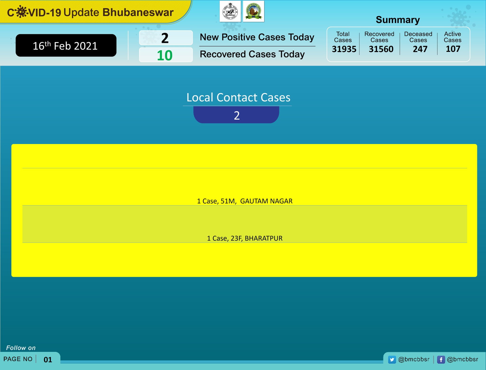 A total of 31,935 people have been infected by the novel coronavirus in Bhubaneswar so far, of which 31,560 have recovered. While 247 have succumbed to the disease, there are 107 active cases at present.