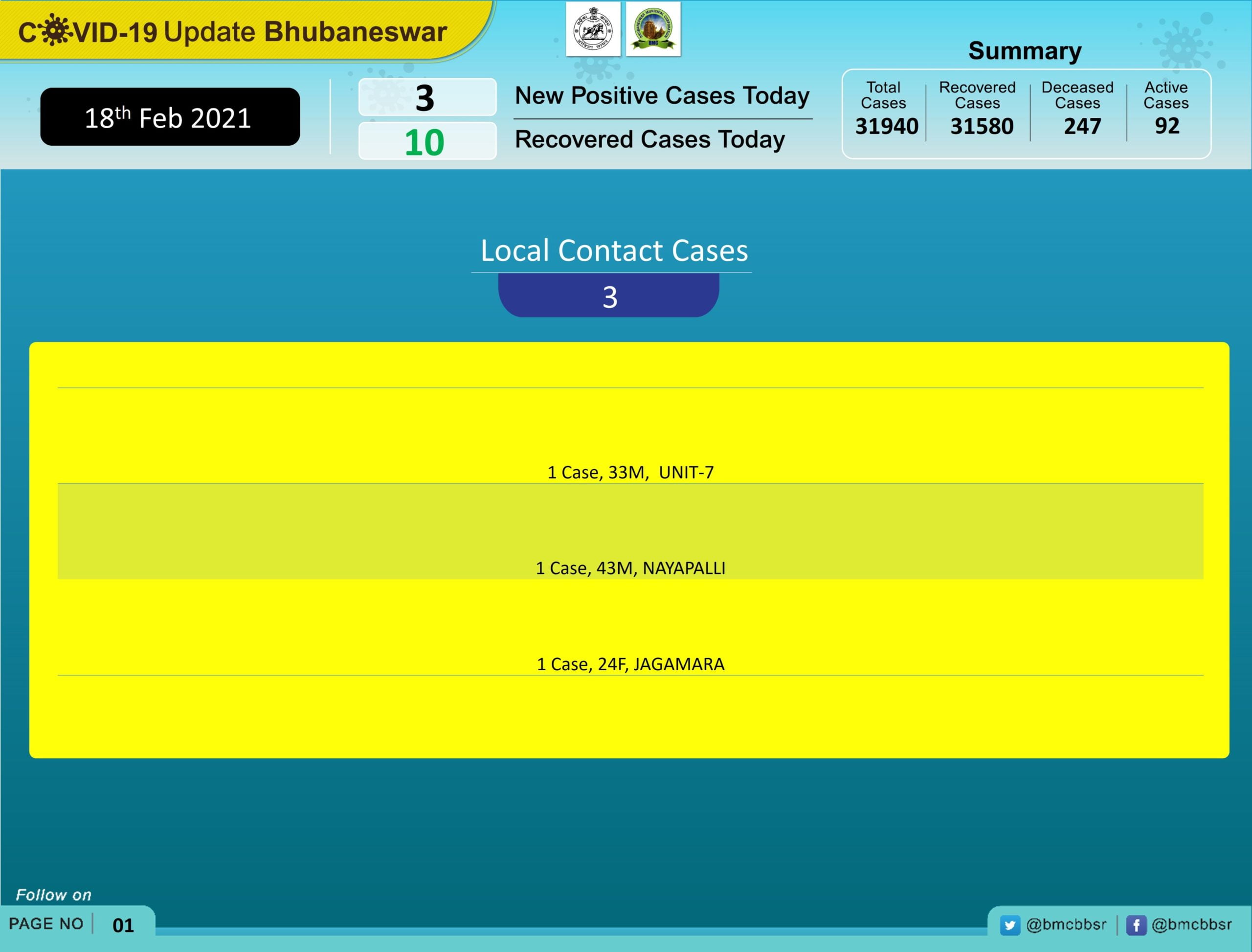 All the new infections are local contact cases. Of them, one each was reported from Unit VII, Nayapalli and Jagamara.