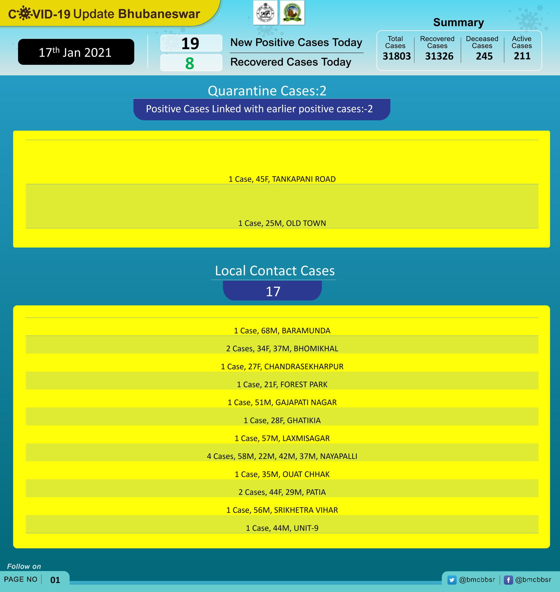 The Bhubaneswar Municipal Corporation (BMC) on Sunday said two of the new cases are from quarantine centres while 17 other are through local contacts.