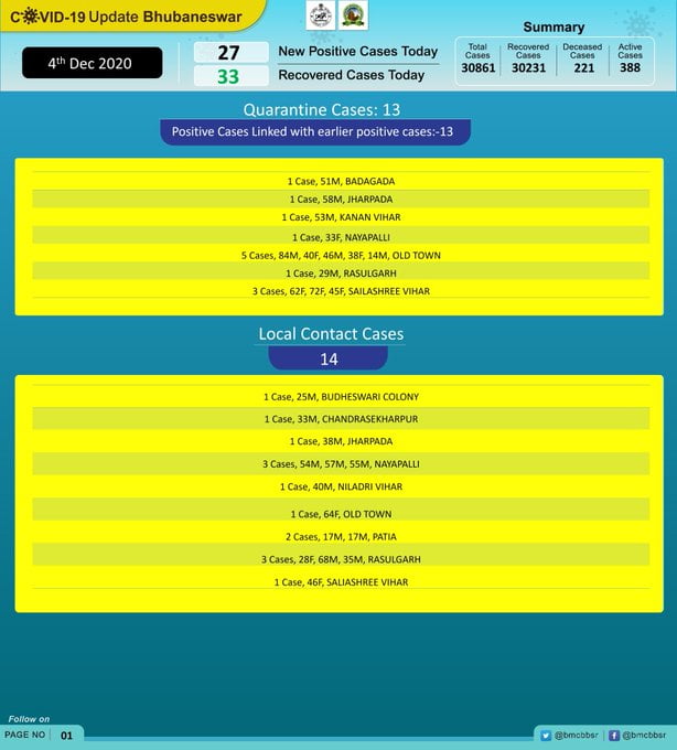 According to the Bhubaneswar Municipal Corporation (BMC), 14 of the new cases are local contacts while 13 are from quarantine.