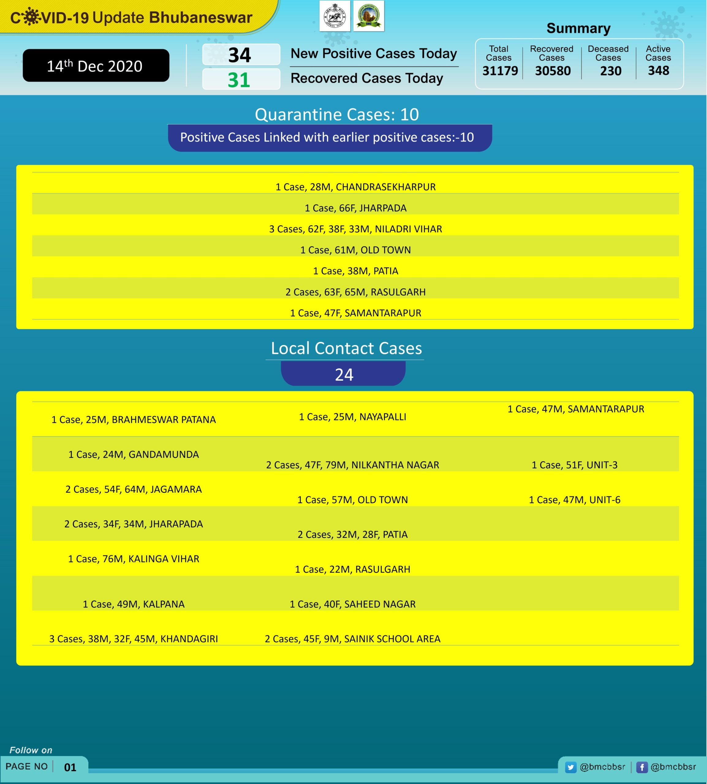 According to the Bhubaneswar Municipal Corporation (BMC), 24 of these new cases are local contacts and 10 are in quarantine.