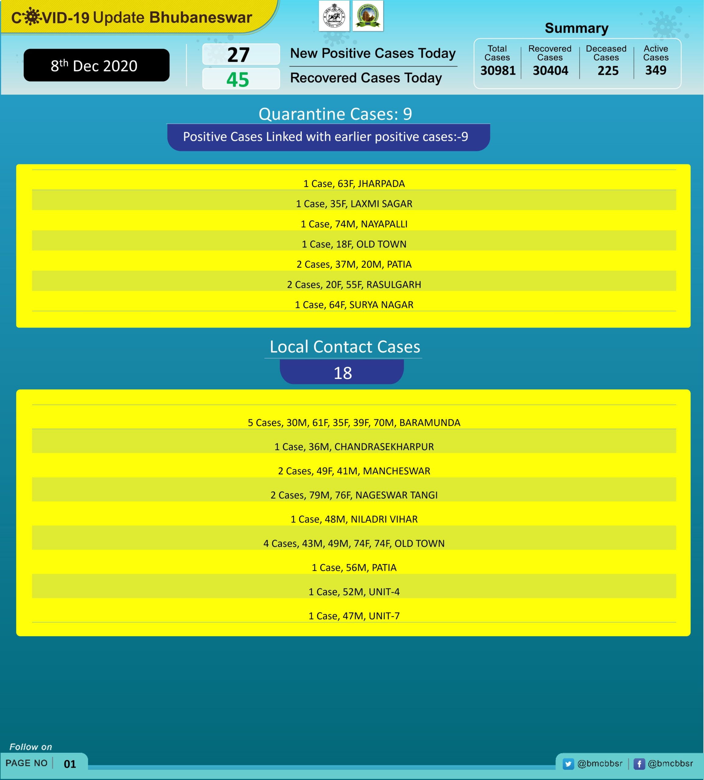 According to the Bhubaneswar Municipal Corporation (BMC), 18 of the new cases are local contacts and 9 are from quarantine.