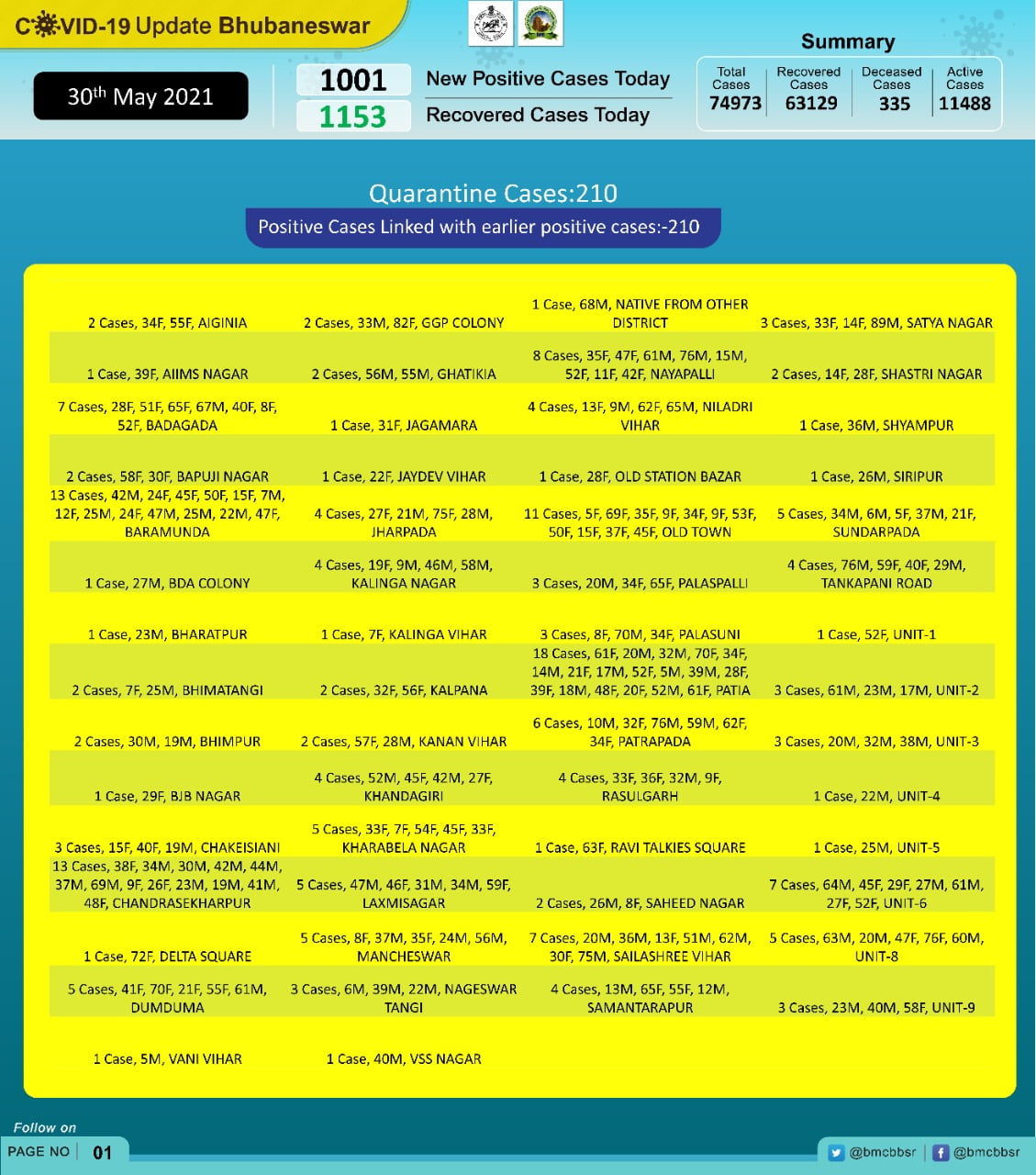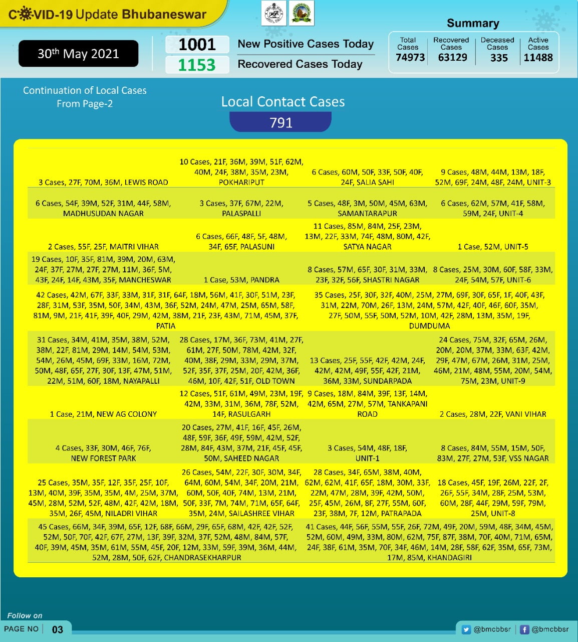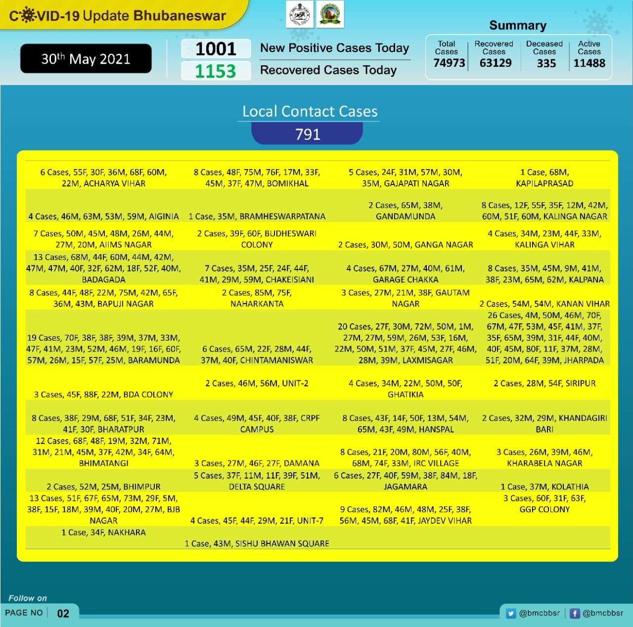 Maximum cases have been reported from Chandrasekharpur (45), followed by, Patia (42), Khandagiri (41), Dumduma (35), Nayapalli (31), Old Town and Patrapada (28 each), Jharpada and Sailashree Vihar (26 each), Niladri Vihar (25), Unit-9 (24), Laxmisagar and Saheed Nagar (20 each), Baramunda  and Mancheswar (19 each) and Unit-8 (18).