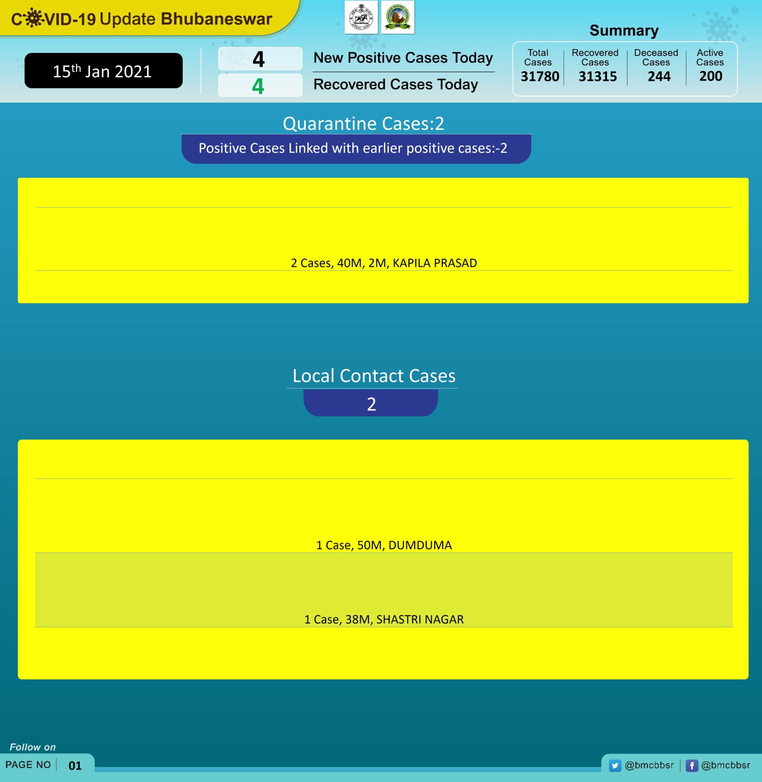 A total of 31,780 people have been infected by coronavirus in Bhubaneswar so far, of which 31,315 have recovered. There have been 244 deaths while the number of active cases is 200 at present.