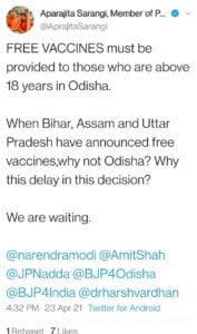 Bhubaneswar: BJP MP Aparajita Sarangi has supported the demand of her party for free COVID-19 vaccines for persons above 18 years of age in Odisha.