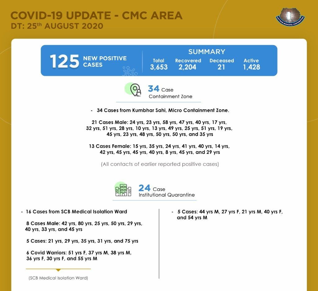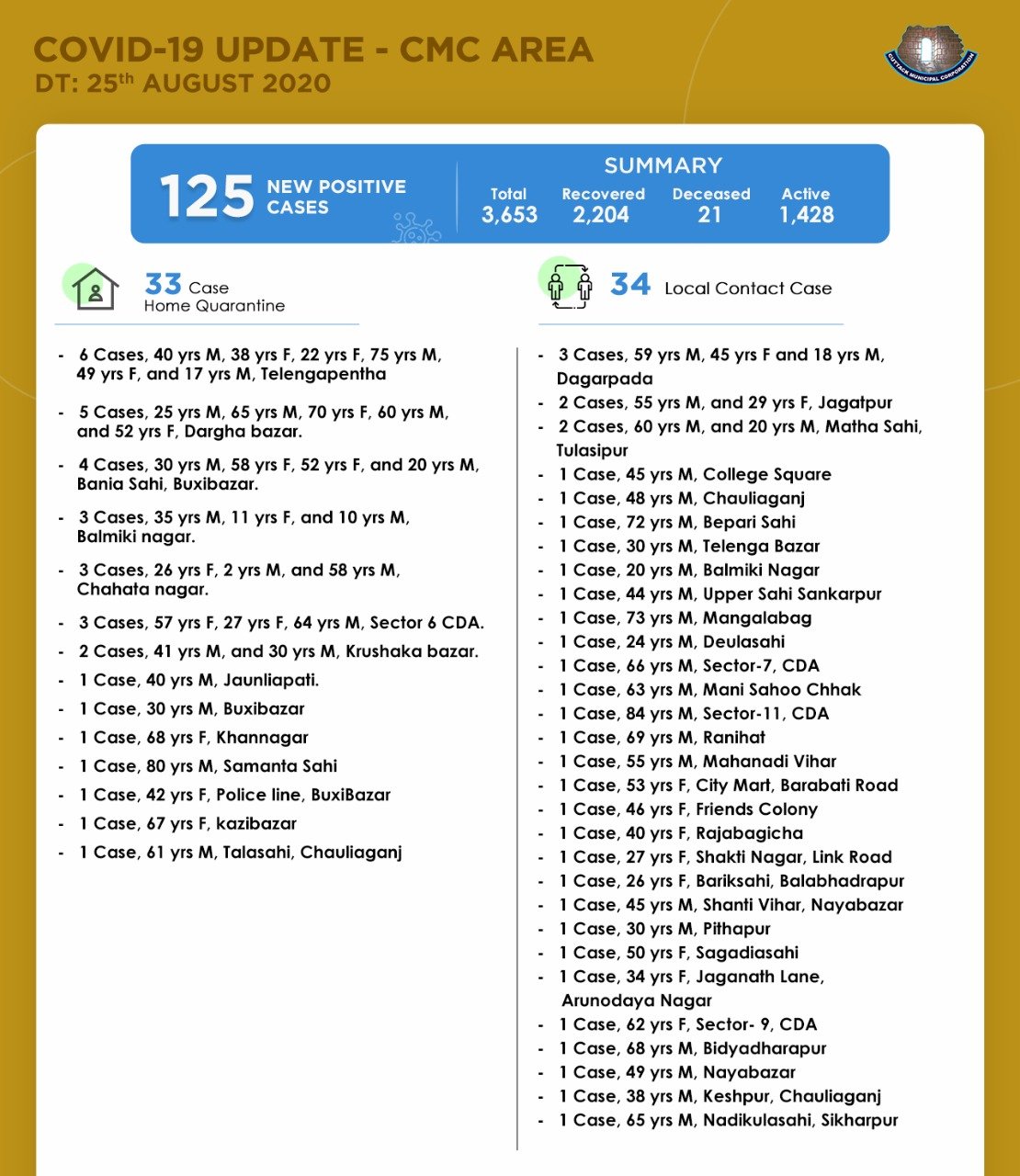 According to the Cuttack Municipal Corporation (CMC), 34 are from Kumbhar Sahi micro containment zone, 33 from home quarantine, 24 from institutional quarantine centre and 34 local contact cases.