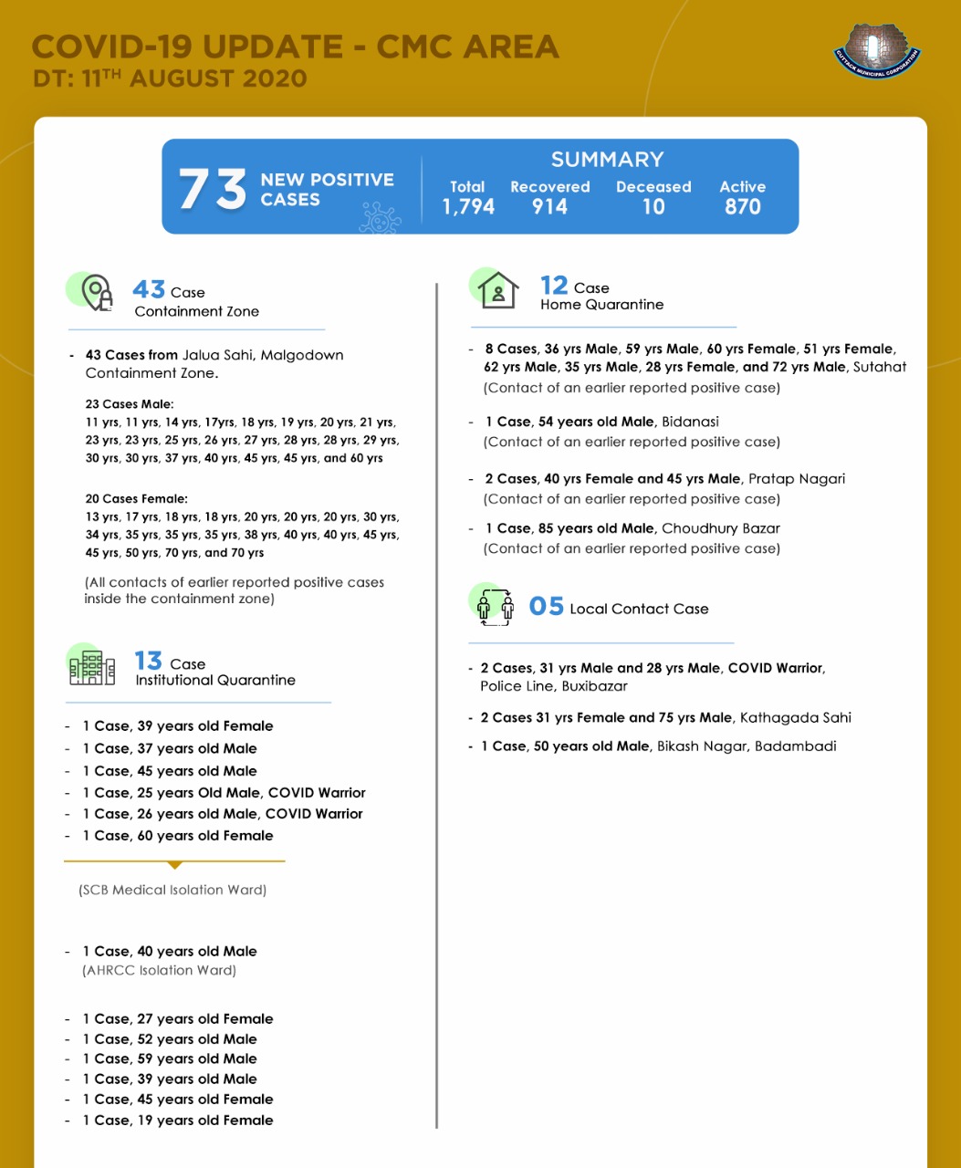 On August 9, CMC Commissioner Ananya Das had informed about 43 positive cases being reported from the area with 24 more testing positive for the virus on that very day. Another 19 cases were reported from Jalua Sahi on August 10.