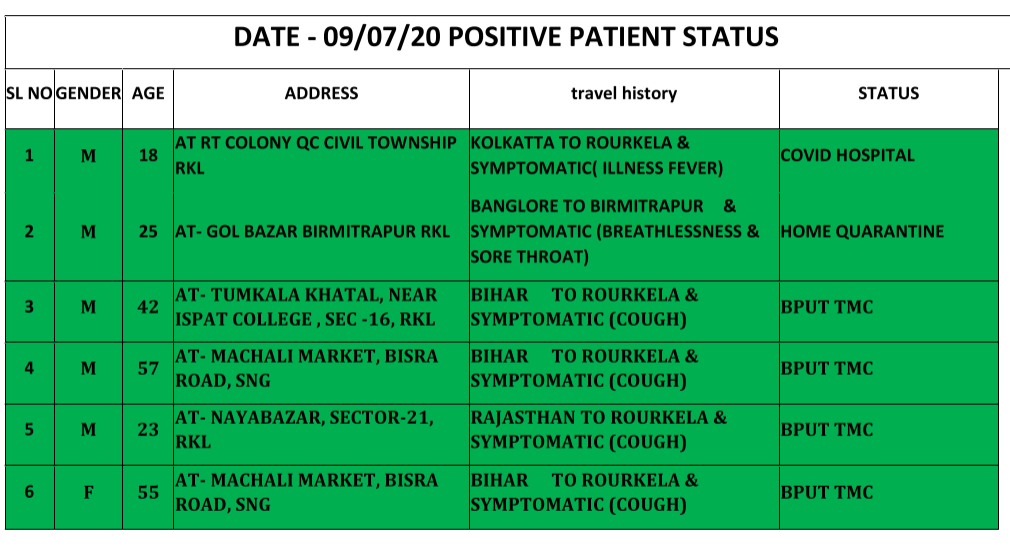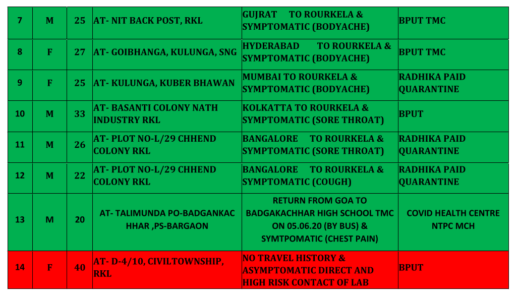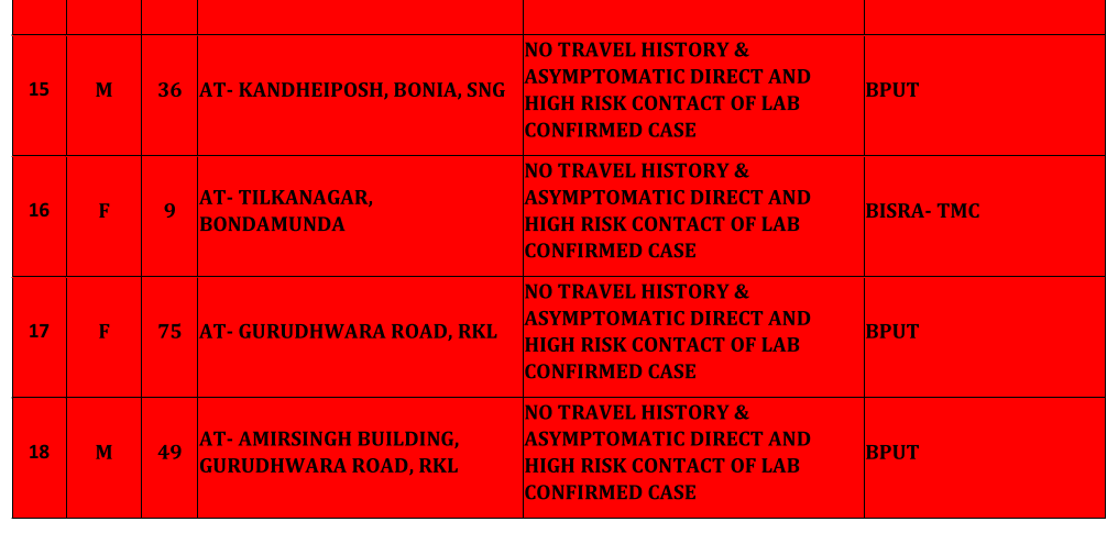 The administration tweeted that two among are at BBSR COVID Hospital, 12 are COVID warriors, one local contact at Kuarmunda, 34 are contacts of previous positive cases and 13 are returnees from outside the district.
