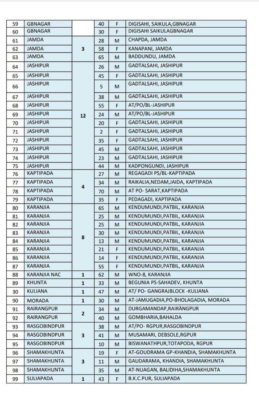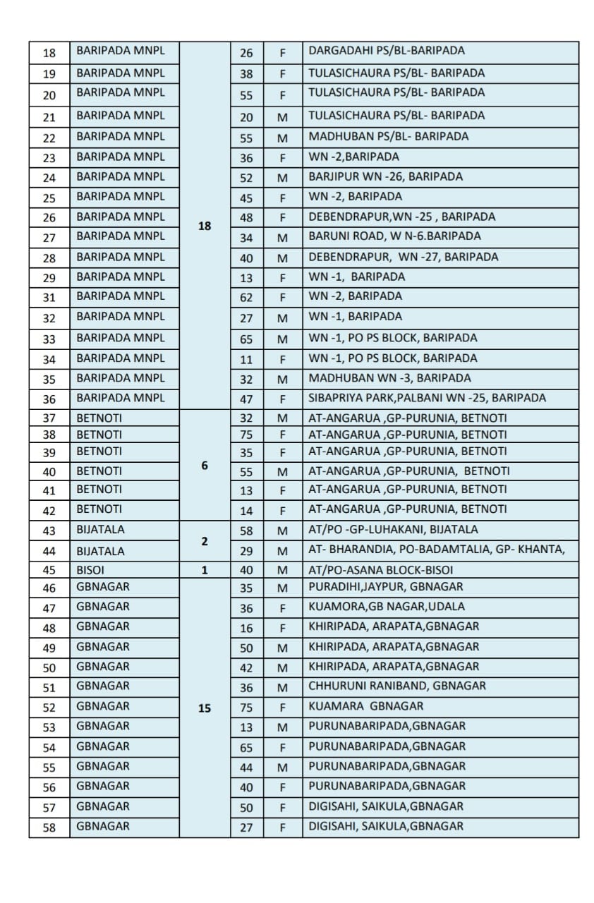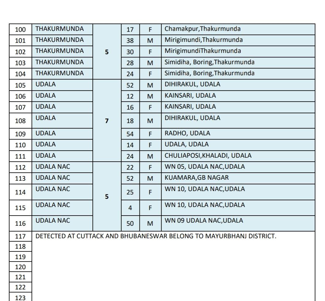 The highest of 18 cases was reported from Baripada municipality area, followed by 15 cases in GBNagar Block area, 12 cases in Jashipur Block area, nine cases in Baripada Block area, eight cases in Karanjia Block area, seven cases each in Bahalda, Udala Block area, six cases in Betnoti Block area, five cases each in Thakurmunda Block, Udala NAC area, four cases in Kaptipada Block area, four cases in Kaptipada Block area, three cases in Jamda, Rasgobindpur, Shamakhunta Block area, two cases each in Bijatala, Rairangpur Block area, one cases each in Bangriposi, Khunta, Kuliana, Morada, Suliapada Block area.