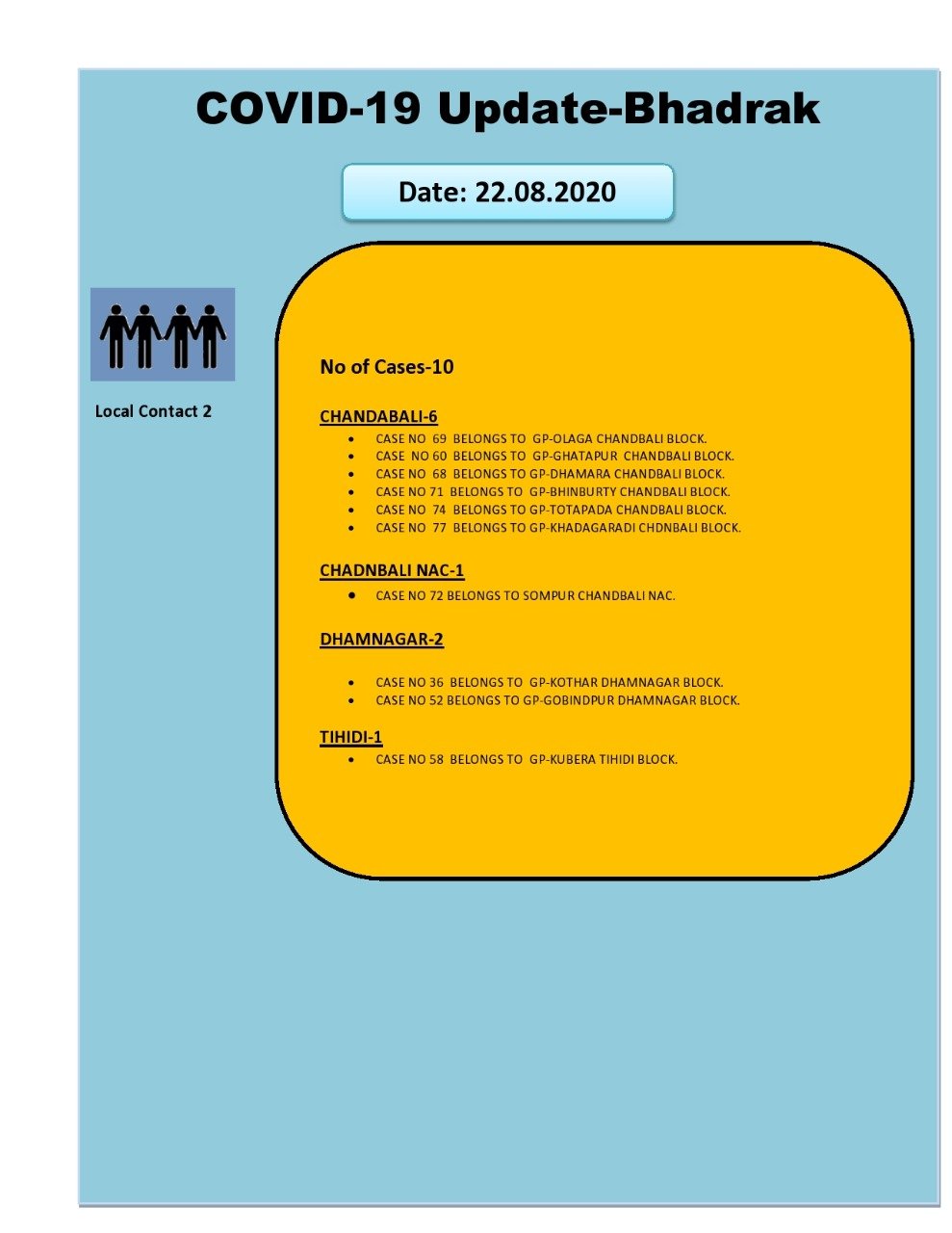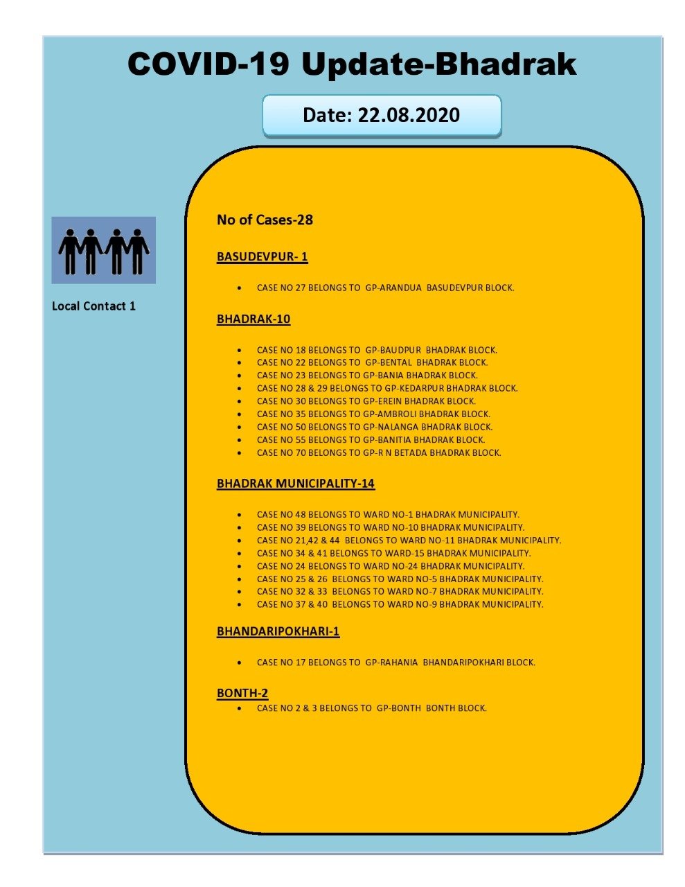 Of the new cases, the highest of 25 were reported from Bhadrak municipality, followed by 14 from Bonth municipality, 13 from Chandabali, 10 from Bhadrak block, four from Tihidi, three each from Basudevpur, Dhamnagar and Chandbali NAC, and two from Bhandaripokhari.