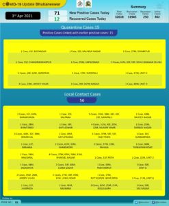 Of the day’s cases, 15 were from quarantine centres and the rest 56 were local contacts, according to Bhubaneswar Municipal Corporation (BMC).