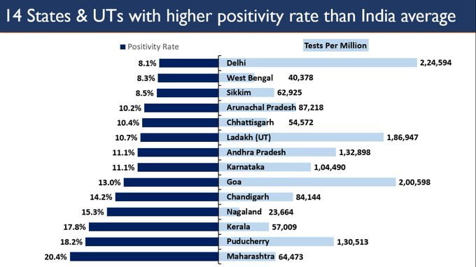 The cumulative positivity rate in the state is 6.55 per cent as against the national average of 7.81 per cent. While Odisha’s positivity rate is below the national average, 14 states and UTs have a higher positivity rate than India average.