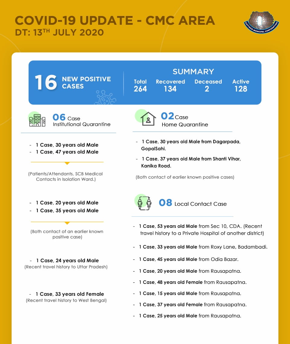 With two deaths and 134 recoveries, Cuttack city now has 128 active cases.