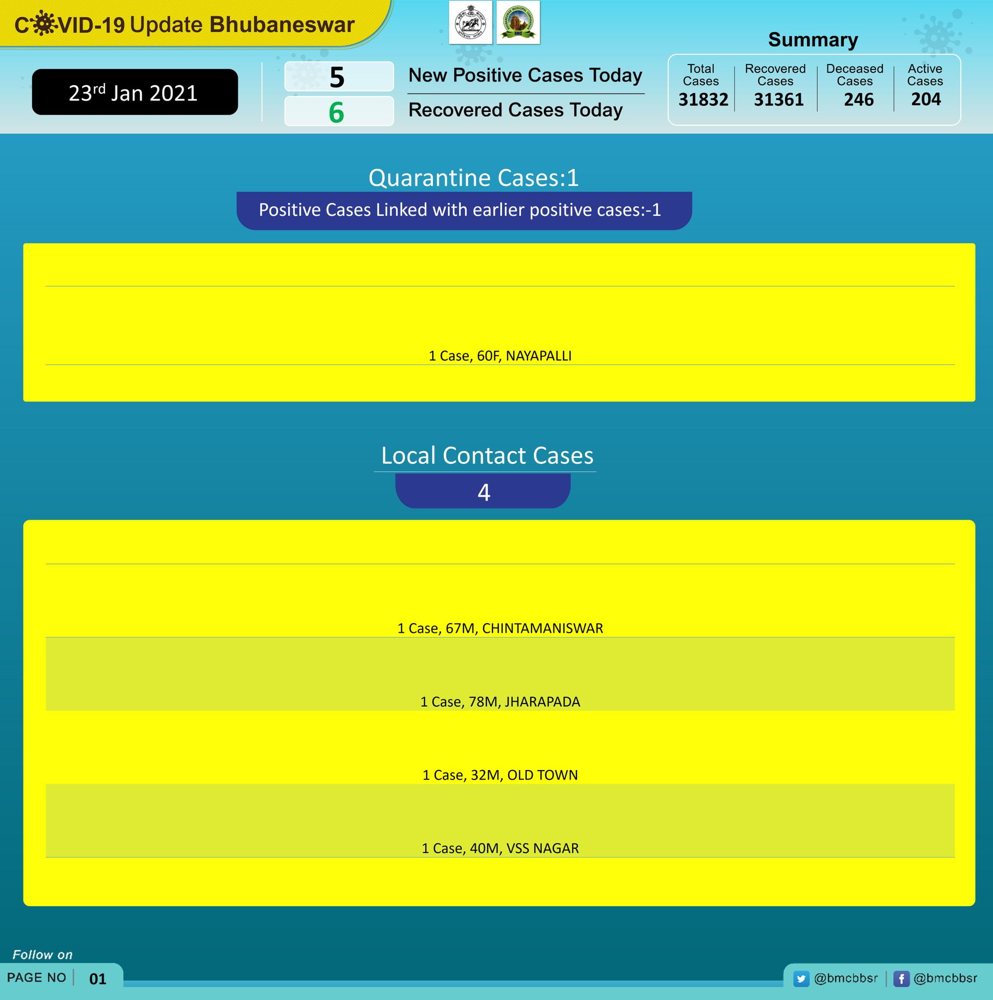 Bhubaneswar Municipal Corporation (BMC) on Saturday said one case was a quarantine case, while four were local contacts.