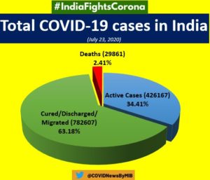 New Delhi: An addition of 45,750 positive cases in the last 24 hours took India’s COVID-19 tally past the 12 lakh mark to 12,38,635 on Thursday.