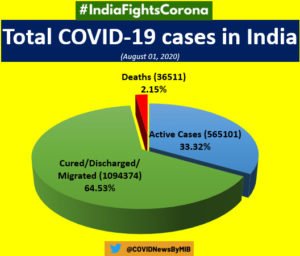 The cumulative recovered cases (10,94,374) have surpassed active cases by 5,29,271. Also, India’s recovery rate remains at 64.53 per cent. The fatality rate of cases dipped a bit to 2.15 per cent and is observed to be falling progressively, according to a Health Ministry release.