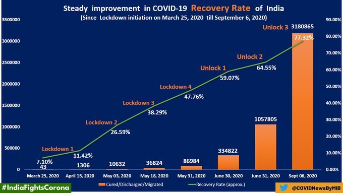 “The highest ever single-day recoveries of 73,642 were recorded on September 6 and currently, the recovery rate now is 77.23 per cent. This has also led to the declining Case Fatality Rate (CFR), which stands at a new low of 1.73 per cent,” Ministry said in a statement. About 77.32 per cent (31,80,866) people have recovered from the infection while another 21 per cent (8,62,320) are under treatment.