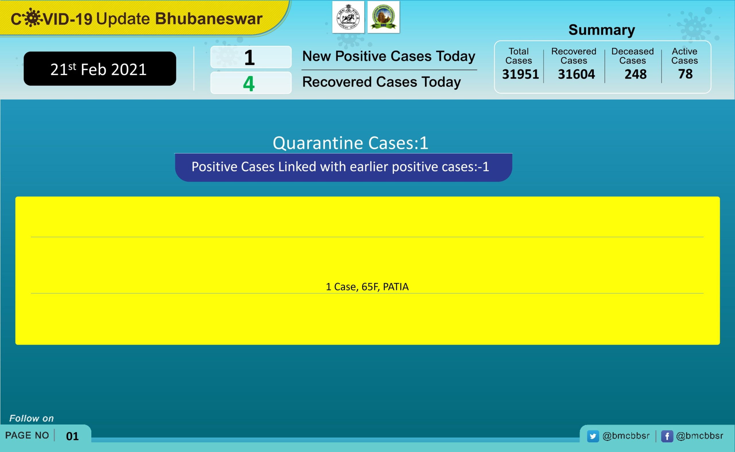 Just one new coronavirus positive case was reported in the capital city in the last 24 hours. Bhubaneswar Municipal Corporation (BMC) informed on Sunday that the solitary case is from quarantine in Patia area.